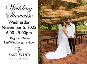 Wednesday, November 5, 2025 from 6:00 - 9:00 PM East Wind Long Island $30 Wednesday, November 5, 2025 from 6:00 - 9:00 PM Join us for our Wedding Showcase where you can meet with top event professionals offering the trendiest styles, floral design, photography and entertainment. Tour our spectacular venue and grounds, including THE VINEYARD and the Shoppes with the Grand Carousel. Taste the culinary creations of East Wind’s Executive Chef, enjoy a live DJ performance and win great prizes. Reserve ONLINE Today! Call 631-929-6585 for more information.